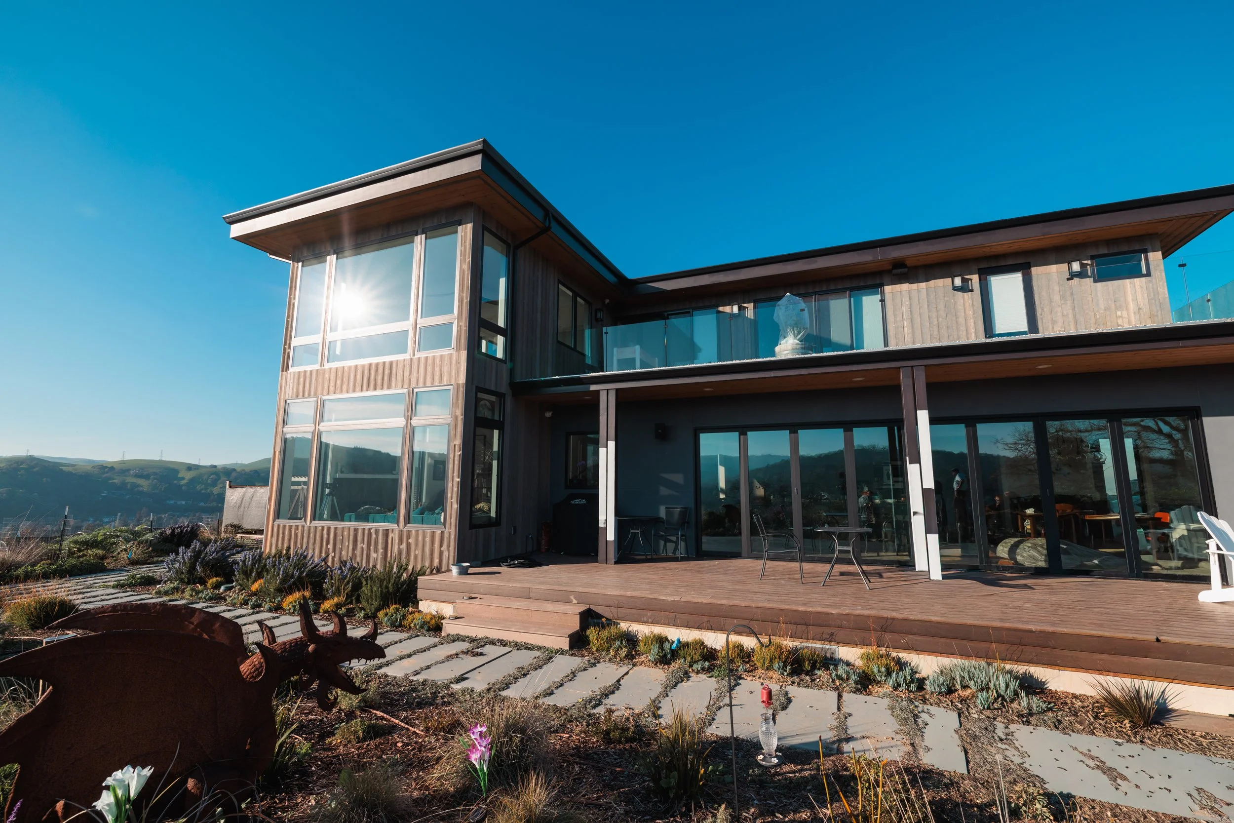 Design featured exterior balconies off the master suite and lower kitchen area, plus large opening glass doors